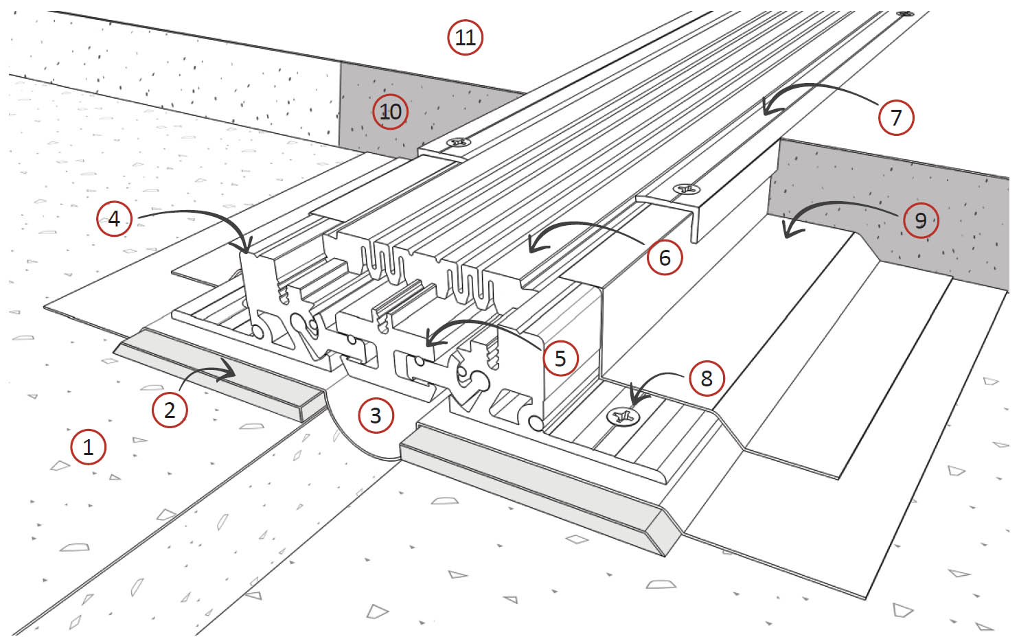(3) 1.14mm thick waterproofing membrane epoxy bonded to the concrete slab and cross-linked to the membrane bonded to the faces of the expansion joint